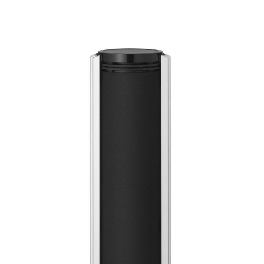 De twee Beolab 28's maken het systeem compleet, uitgevoerd in Cosmic Black – een oneindig diepe tint. Aluminium lamellen bekronen de donkere stof eronder, die parelmoerglans heeft gekregen voor een hoog contrast. Het is de eerste keer dat we dit proces of deze kleurstelling hebben gebruikt.